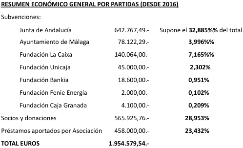 Nota: La Junta de Andalucía se posiciona como el principal apoyo institucional con el 32,8% del total, complementado por una red diversificada de fundaciones privadas y el aporte constante de socios y donaciones.